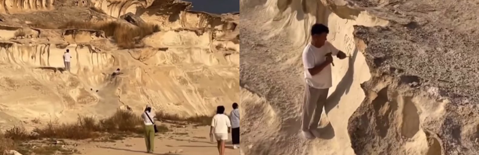 Ранее в Сети появилось видео, на котором мужчина выбивает надпись на древних скалах каньона Ыбыкты сай. inaktau.kz »