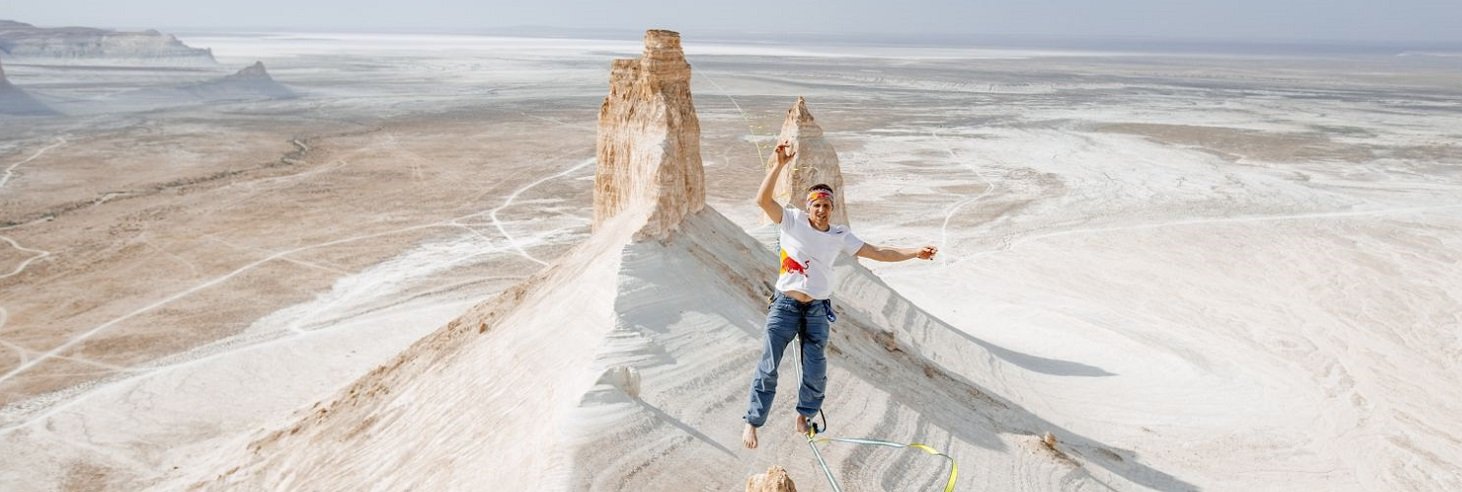 Известный эстонский слэклайнер Яан Роозе стал первым, кому удалось пройти по стропе между двумя клыками знаменитого казахстанского урочища Бозжыра в Мангистауской области, которое миллионы лет назад покрывал древний океан Тетис. Фото: redbull.com Сп tumba.kz »